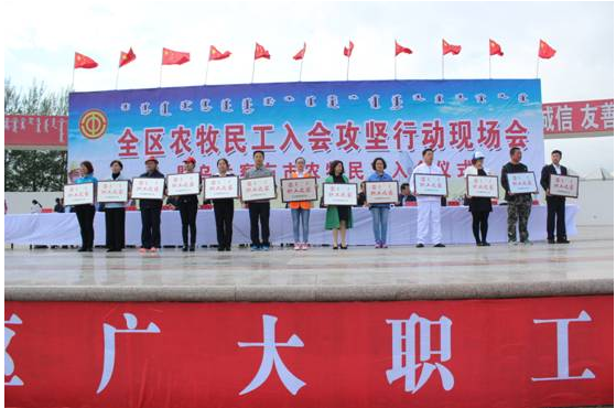 6月14日,全區(qū)農(nóng)牧民工入會攻堅行動現(xiàn)場會暨烏蘭察布市農(nóng)牧民工入會儀式在我市舉行。我公司組織30人的方隊參加了入會儀式。期間,自治區(qū)人大常委會副主任、總工會主席杭桂林,自治區(qū)總工會黨組書記、副主席崔明龍,自治區(qū)總工會副主席王麗紅,我市領(lǐng)導(dǎo)張琛、李建平、楊國文、王增強、王國相、于生龍,和各盟市工會分管主席、主管部門部長,各盟市黨委政府所在地的區(qū)(市、旗)總工會主席,各自治區(qū)產(chǎn)業(yè)工會負責人,自治區(qū)直屬機關(guān)工會工委負責人,區(qū)總相關(guān)部門負責人,市各旗縣市區(qū)工會負責人及部分市直基層工會負責人100余人來我公司進行了實地觀摩考察。